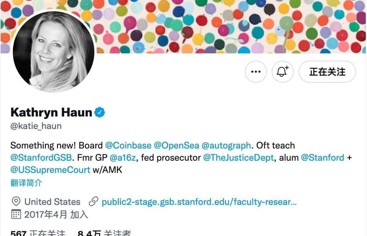 KatieHaun以在美國司法部任職長達十年,參與打擊加密犯罪的背景而聞名。據CNBC報道,KatieHaun早年在國外度過,先后就讀于美國波士頓大學和斯坦福大學法學院,其后在美國聯邦法院開啟法律助理的生涯。Linkedin頁面顯示,自2006年起她在美國司法部任助理檢察官及數字貨幣協調員,期間曾專門從事網絡犯罪、暗網、金融科技、加密貨幣、區塊鏈、反洗錢等方面的調查和起訴。美國著名的暗網“絲綢之路”案件中,兩名聯邦特工在臥底期間“腐敗”,盜竊了數十萬美元的比特幣,KatieHaun是起訴兩人的主力之一。此后KatieHaun被a16z“挖角”,自2018年6月起任普通合伙人,并與另一合伙人Chrisdixon創立a16z的首個加密投資基金,擔任a16z迄今為止所有三支加密基金的聯合主席,期間她的投資組合包括Opensea、NFT音樂平臺Royal等。根據公開報道,KatieHaun在a16z的貢獻還體現在團隊招聘和政策游說上。Chrisdixon在采訪郵件中告訴《財富》雜志,四年間a16z的加密投資團隊從兩人擴張到約50人,其中KatieHaun招募了“大多數”成員。政策游說方面,a16z以能為投資公司提供從市場營銷到監管合規等全方位的服務而聞名,這也和其人才儲備有關。依靠其在華盛頓的政府人脈背景,2021年夏天,KatieHaun為a16z招募了拜登總統前助手TomicahTillemann,并于下半年在華盛頓發起了加密監管的游說活動,后者是該場行動的主力。