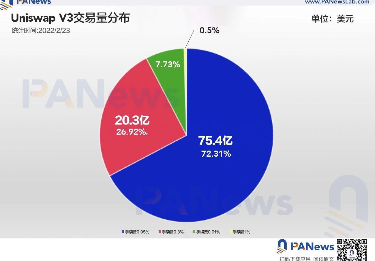 XRP/HKD-7.25%UniswapV3在上線之后,首先吸引人注意力的是通過流動性聚集提高了流動性提供者的資金效率。經過大半年時間的發展,PANews發現曾經可能被忽視的一個特點——可自定義交易手續費,使Uniswap在DEX的交易量中處于近乎壟斷的地位。通過分析Uniswap和其它DEX的交易數據,我們發現當前UniswapV3的優勢包括:?提供更低的交易手續費,72.31%的交易都發生在0.05%一檔手續費的交易對中。?由于交易量的提升,0.05%手續費交易對的流動性提供者收益高于0.3%的交易對。?Uniswap在以太坊上的交易量占比從47.2%升至80.4%,同期,其它DEX的交易總量下降。?在USDC/USDT交易對中,UniswapV3在千億美元級別的交易中,兌換比例優于Curve。?UniswapV3的多鏈部署也已經開始展現優勢,上線Polygon即超越QuickSwap。UniswapV3交易量分布:0.05%手續費的交易占據72.31%