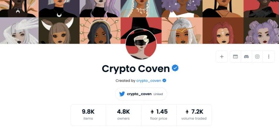 CryptoCoven是在2021年萬圣節之夜開始發售的一組NFT。這組近一萬張女巫頭像各不相同,她們有的是貓眼,有的有面紗,或是先知,或是巫師,組合成了風格各異的女性形象。