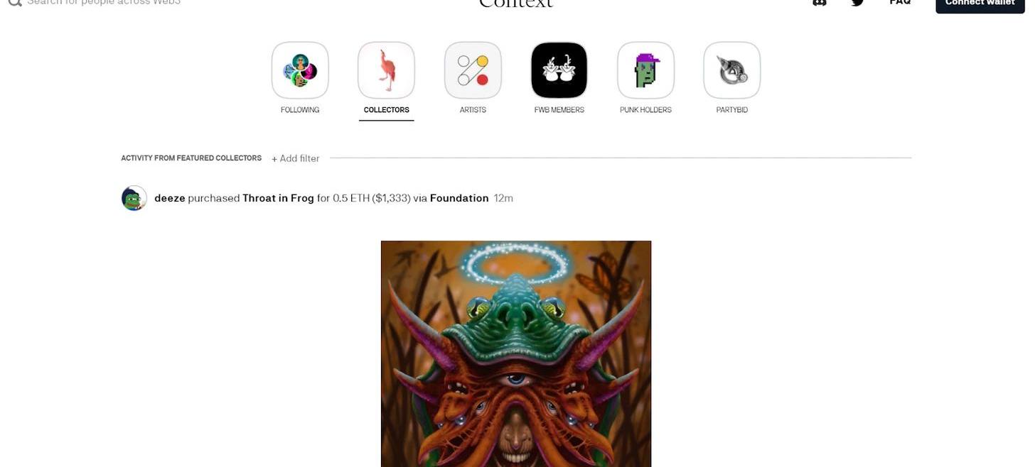 Context是用于跟蹤顯著NFT活動的實時feed工具。您可以使用該網站根據預先制作的類別來跟蹤發生的事情,例如CryptoPunk持有者、FWB成員或著名的加密藝術家正在鑄造的內容。此外,您可以通過關注您感興趣的特定帳戶來連接您的錢包以開始個性化您的feed。使用Context進行鏈上分析也許你在Twitter上發現了一兩個人似乎總是比其他人先找到下一個大型NFT項目。查看他們是否在任何地方顯示了公共ENS或以太坊地址。如果是這樣,請轉到Context并將地址添加到您關注的帳戶中。然后,每當該人或其他人創建新項目時,您就可以在實時ContextFeed中跟蹤發生的事情并采取行動!結論