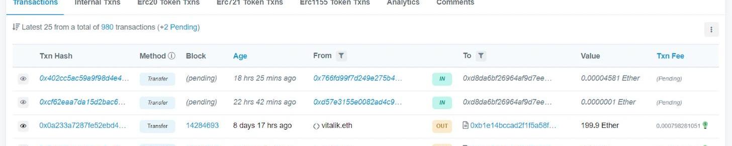 Etherscan是一個區塊瀏覽器,一個特殊的瀏覽器平臺,用于審查和分析存儲在以太坊上的所有數據。該服務允許用戶通過地址、交易哈希、區塊高度、代幣名稱等搜索和檢查歷史信息。Etherscan提供額外的資源,如ETH單位轉換器、標簽詞云、驗證合約工具等。請記住,其他網絡,如各種以太坊擴展解決方案,都有自己定制的區塊瀏覽器。另外,請查看:Arbitrum:ArbiscanOptimism:TheOptimisticEthereumExplorerPolygon:PolygonPoSChainExplorerAxieInfinity:TheRoninBlockExplorerZkSync:zkScan使用Etherscan進行鏈上分析Etherscan是所有加密分析師的基礎資源,因為這個區塊瀏覽器可以輕松解析以太坊交易的所有基本細節。然后,您可以通過查看和理解交易流來拼湊更大的圖景。因此,如果您還沒有學習如何在Etherscan上“讀取”交易,您需要去學習。例如,讓我們快速瀏覽一下以太坊創建者VitalikButerin的主要地址。我在Etherscan上搜索了他的公共ENS域名vitalik.eth,這將我引導到他的地址頁面和最近的交易。在下面可見的第一筆交易中,我們可以看到Buterin向一個地址發送了0.1ETH的測試交易作為預防措施,然后立即向同一地址發送更大的金額199.9ETH。