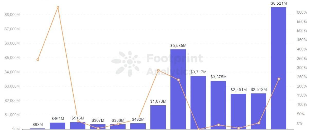 在加密資產價格受到政策影響而下跌的情況下,投機資金正流向收藏品、游戲和藝術等的NFT市場。促使NFT市場空前活躍,交易量高達85.2億美元創下新高值。