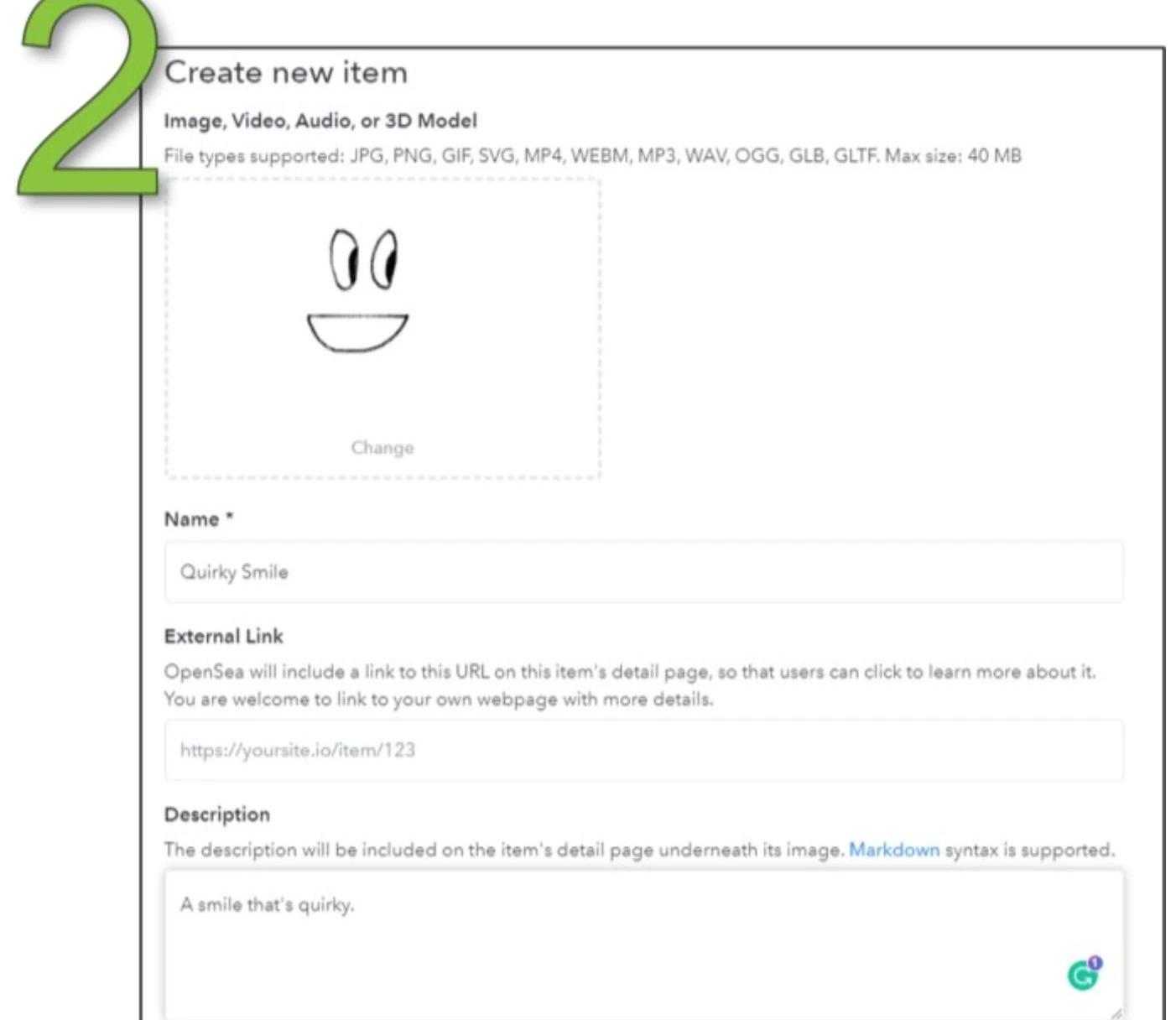 添加NFT文件;它可以是一個圖像或視頻。OpenSea支持多種格式,包括JPG、PNG、GIF、MP4等等。給它取名字和簡單描述。還有一個選項是為NFT添加一個外部鏈接,比如一個到你個人網站的鏈接。