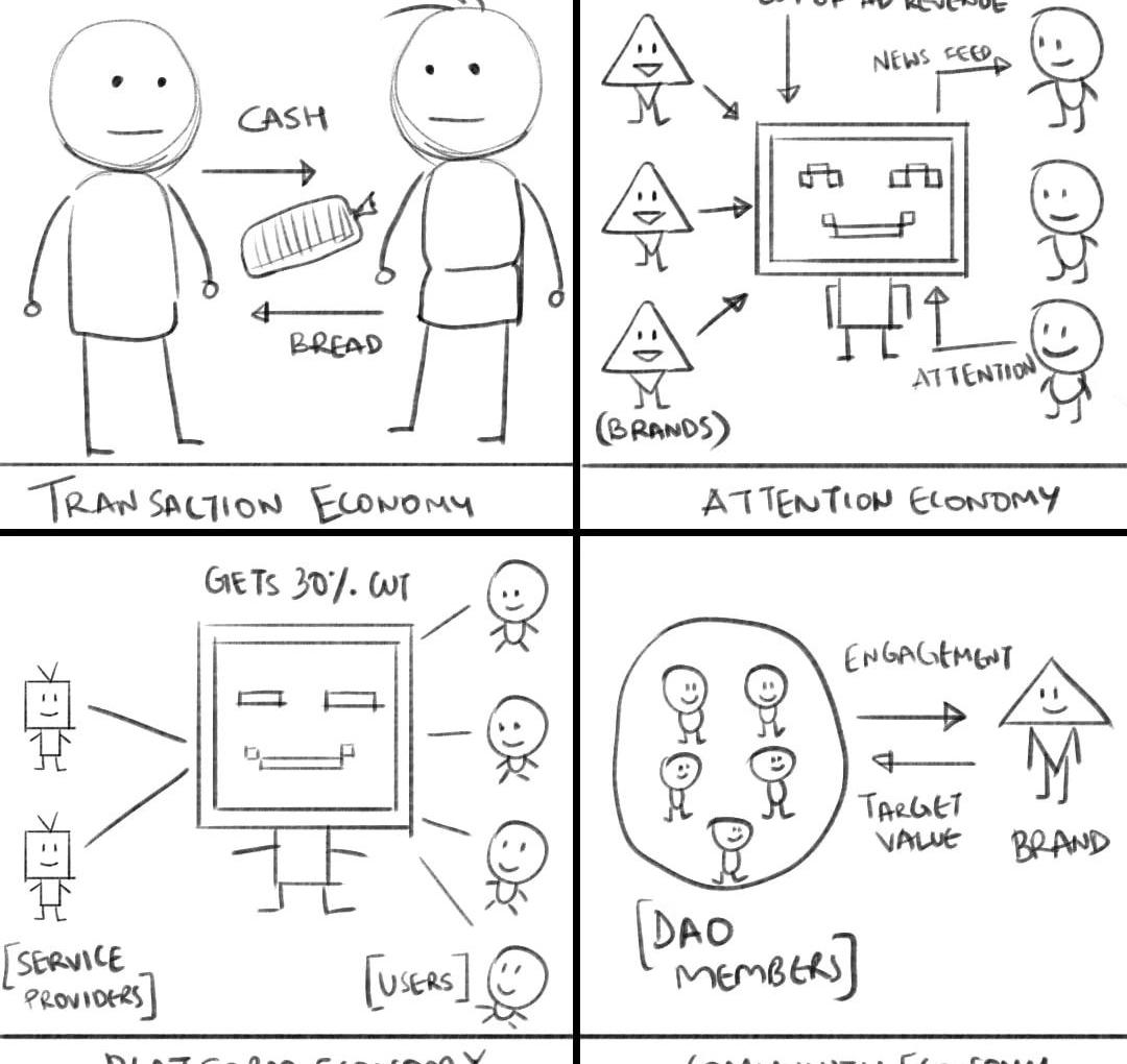 經濟的演變有四個主要的階段,不同階段可以根據資源支出和所有權來進行細分。早期的人類經濟是資源密集型的,很少尊重所有權。階級等級制度確保最低等級的人幾乎不能擁有他們的勞動所得。隨著時間的推移,對一個人花時間工作給予所有權成為了一種規范。想一想我們是如何從日薪到利潤分配,逐漸穩步發展到現在的員工股票期權的,以下是對事情發展的簡要回顧:交易經濟——這些經濟的標志是用金錢交換商品或服務。人類歷史上的大部分時間都在交易經濟中運行,想想易貨貿易、絲綢之路或最終的殖民化,交易經濟是所有這些的支柱。在船舶和貿易路線等技術到來之前,交易經濟的重點是當地市場,它一直持續到印刷術的到來。注意力經濟——印刷術降低了復制信息的成本。但是直到18世紀全球人口的識字率才出現了激增,書籍才有了專屬的市場。如前所述,報紙是我們今天平臺的早期先驅。注意力經濟是一種出售注意力而不是商品的經濟。1995年,A&T在HotWired上首次推出了橫幅廣告,將這種模式帶到了網上。僅在去年,Youtube靠吸引注意力就賺了290億美元,他們幾乎沒有生產成本,而且客戶粘性也很高。你可以像臉書那樣把用戶數擴展到一個國家的規模,而不必擔心成本按比例上升。平臺經濟——平臺經濟將賣家和服務提供商與潛在買家聯系起來。亞馬遜這樣做獲得了接近4890億美元的收入,Uber按照同樣的模式將其利潤從2013年的1億美元擴大到2020年的130億美元。由于發現和信任在平臺上發現的供應商,平臺的價值得到了累積。今天,我們每天使用的大多數移動應用程序都有一個平臺在進行,平臺的成本在于供應商的策劃和來自足夠大的用戶群的信任。社區經濟——社區經濟是合作社的演變。我們沒有談論DAO的宏觀經濟背景,但我是這樣看待它的:互聯網讓我們有機會進入全球市場,智能合約使我們能夠在沒有中間人的情況下相互信任。新冠病大流行提醒我們,人的一生真的非常短暫,一個人應該為自己擁有的東西而努力奮斗;此外,它還告訴我們,一個人即使可以做所有正確的事情,也仍然會被生活搞垮,失業潮就是最好的證明。所以我們一直處于探索替代經濟模式的階段,這就是DAO的作用,它們將個人自主權與早期不存在的經濟機會聯系起來。社區經濟是用戶管理他們使用東西的實例。這些經濟模式留下了經濟互動的鏈上證據,保證這些經濟參與者的數據開放。社區經濟與平臺經濟和注意力經濟的不同之處在于,關于參與者的數據通常不會被儲存在公司擁有的服務器上,任何人都可以在此基礎上進行查詢和建設。Gitcoin、ENS、Covalent、Biconomy和LobsterDAO等基于NFT的DAO就是這樣的例子。那股東驅動的公司是一種社區經濟嗎?我還不太清楚這個問題的答案,也許你可以說GameStop符合這個定義,但現在還是讓我們先回到NFT的主題上吧。我們現在處于什么階段?