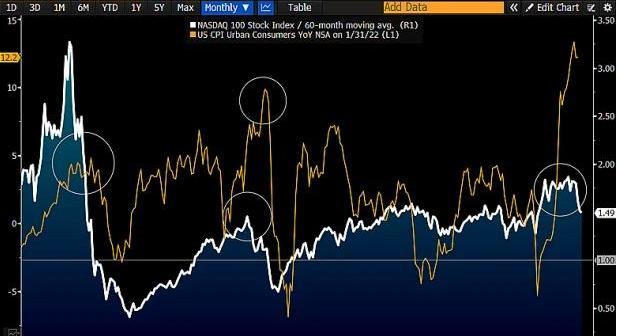 上圖:美國通貨膨脹問題可能無法在短期內得到解決。自2009年市場從金融危機中復蘇過來之后,納斯達克100指數交易價格從未低于5年均值線,但現在市場似乎正處于崩潰邊緣。美元贏得加密戰爭