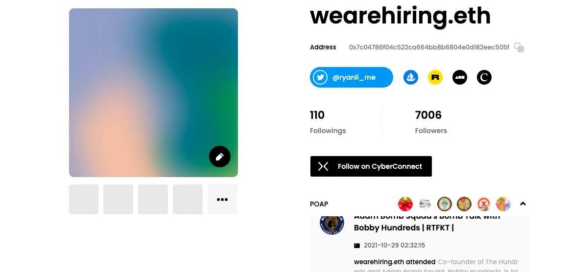融資:2021年11月,CyberConnect完成1000萬美元種子輪融資,MulticoinCapital和Sky9Capital共同領投,AnimocaBrands、DraperDragon、Hashed、ZooCapital、SmrtiLab和MaskNetwork等參投。CyberConnect也如RSS3一樣,也是一個呈現用戶「鏈上畫像」的平臺。