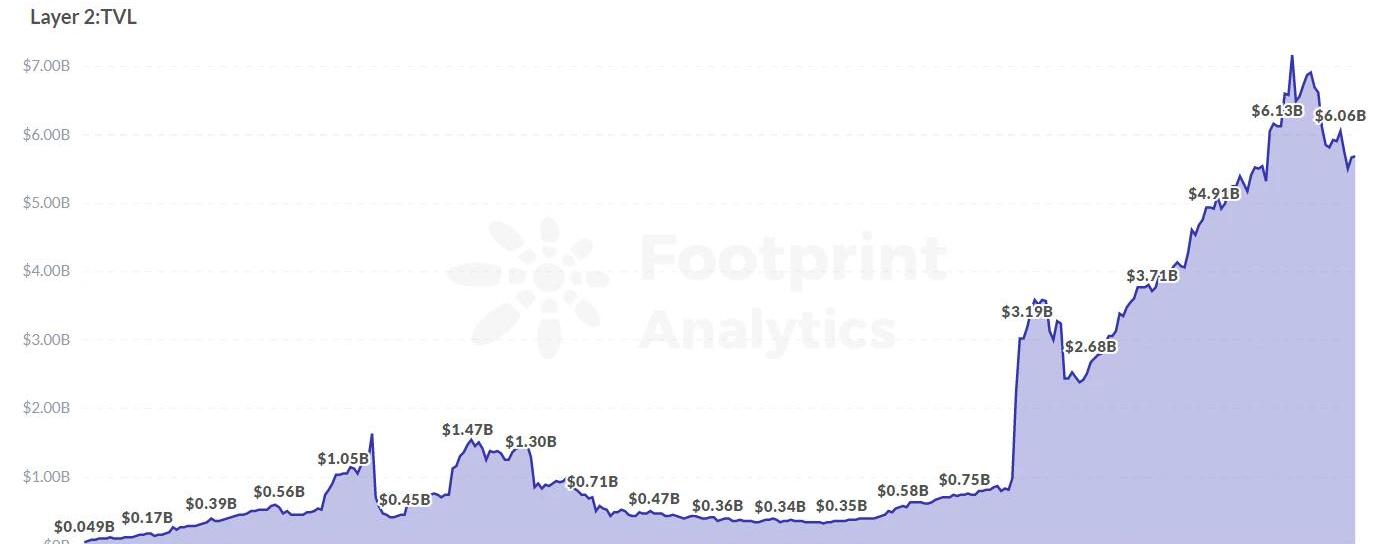 Layer2擴容解決方案經過多年的更新迭代,實現在以太坊上擴容的安全方案,緩解以太坊網絡的擁堵和高gas費等問題,成為了解決區塊鏈技術規模化應用的主流技術方案,每種方案都有自身的優勢和劣勢,但每個Layer2項目都根據自身情況去開發相應的技術,從而實現其最大的價值。Layer2的技術創新以及快速的發展,同時也在推動了DeFi市場、NFT和虛擬世界等的發展,在提高網絡吞吐量、減少開發者的工作量和交易效率等中,象征著Layer2是以太坊擴展的未來。以上內容僅為個人觀點,僅供參考、交流,不構成投資建議。如存在明顯的理解或數據錯誤,歡迎反饋。本作品為作者原創,轉載請注明出處。商用轉載需聯系作者授權,擅自商用轉載、摘編或利用其它方式使用的,將追究相關法律責任。FootprintAnalytics官網:https://www.footprint.network/Discord社群:https://discord.gg/3HYaR6USM7微信公眾號:Footprint區塊鏈分析(FootprintDeFi)關于FootprintAnalytics:FootprintAnalytics是一個一站式可視化區塊鏈數據分析平臺。Footprint協助解決了鏈上數據清理整合的問題,讓用戶免費享受0門檻的區塊鏈數據分析體驗。提供千余種制表模板和拖拽式的作圖體驗,任何人都可以在10秒內建立自己的個性化數據圖表,輕松洞察鏈上數據,了解數據背后的故事。