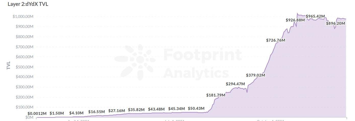 FootprintAnalytics:DYDXTokenPrice其作為DeFi衍生品龍頭,也是ZKRollup技術最早采用者之一。整體的數據表現:繼8月份以來,TVL持續上漲的態勢穩住Layer2項目的前2名,當前TVL為9.76億美元,其Token(DYDX)價格有所下降趨勢,當前為9.04美元,市值為5.7億美元。4.Validium是混合擴容解決方案,安全性較低