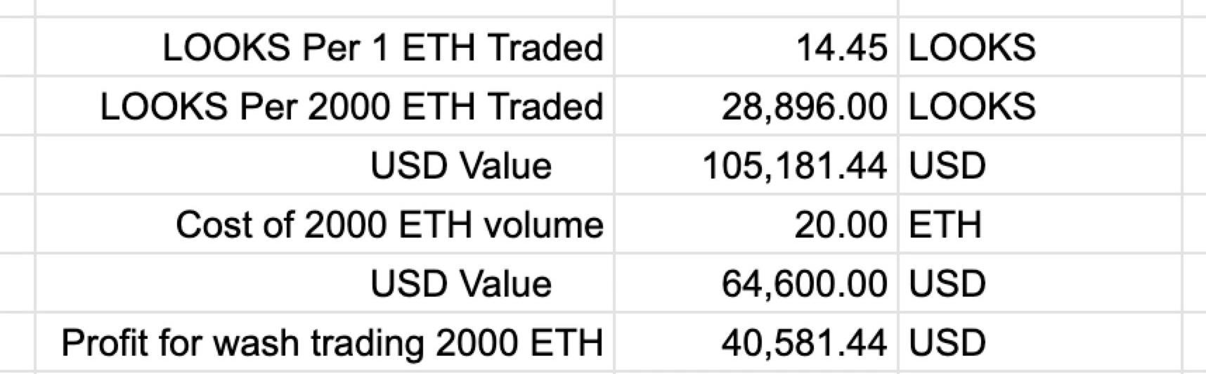 這也是為什么刷量的人利用有資格獲得交易獎勵的收藏品系列,如Meebits和Loot的0%版稅,所以他們洗盤的成本比較低。是的,僅Meebits就有40,500個ETH的交易量。這時你可能會想,這真是太糟糕了。他們怎么能讓人們通過刷量來獲得這樣的獎勵呢?開發者們快想想辦法吧!首先,刷量是有成本的。每筆交易都會將2%的WETH費用獎勵給給LOOKS的質押者。如果你交易了1,000個ETH,你將會減少20個ETH的費用。請注意,通過刷量1,000個ETH,你實際上創造了2,000個ETH的波動,因為他們既是買方又是賣方。因此,讓我們看看一個擁有2000ETH交易量的人在第一天會賺到多少代幣。