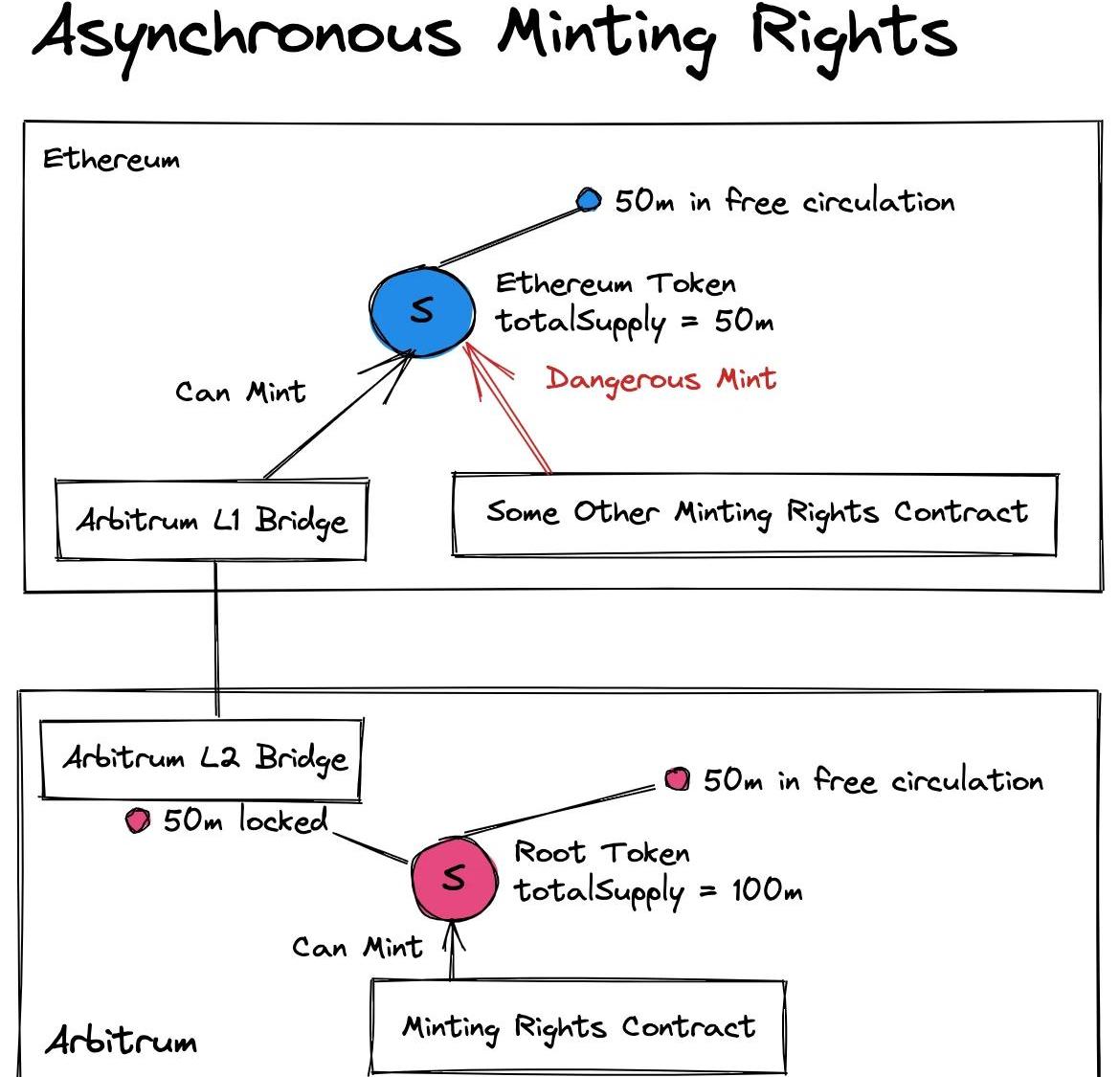 如果你把鑄幣的能力擴展到根鏈之外,那么你可能會遇到這樣的情況:鎖定在橋上的代幣數量變得少于鑄幣的總供應量。這就破壞了包裝代幣的贖回能力,從而破壞了它與根代幣的可互換性。我們不希望這樣的事情發生。