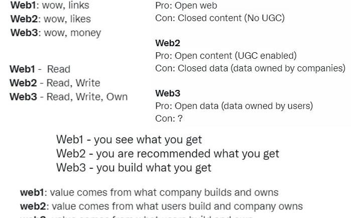 從網上搜羅了幾個這些說法分別指向了web3的幾個突出特征:數據產權、社區共建共享、開源、數據透明、個體價值創造、價值層。數據產權:個體擁有私人數據的所有權,可以利用自己的數據創造及獲取價值;私人數據由隱私技術確定邊界。與web2巨頭壟斷用戶數據相對應。社區共建共享:在以區塊鏈為底層技術的web3背景下,共識成為價值發現的基石。社區/DAO建立于共識之上,共同建設、共同分享建設成果。與現代企業制度相對應開源:共識的前提是開源,共建共享的前提是開源。開源是未來基于算法的信任機制。數據透明:數據在共識認可下被記錄,可追溯、不可篡改。個體價值創造:個體能夠作為一個完整體,通過算法建立的合作機制與他人完成分工生產。各類治理問題開始變得清晰簡明。價值層:web3建立在貨幣等價值底層之上,這讓數據確權與交換、社區共建共享、個體價值創造等擁有了激勵引導。web3的技術底層是區塊鏈。區塊鏈具有分布式記賬,交易可追溯、不可篡改,公開透明,智能合約可編程性、“算法+激勵機制”協同驅動等特點。我之前也寫過一篇文章可進一步了解:說說我對區塊鏈行業的一些看法2、區塊鏈對現存問題的可能解決途徑
