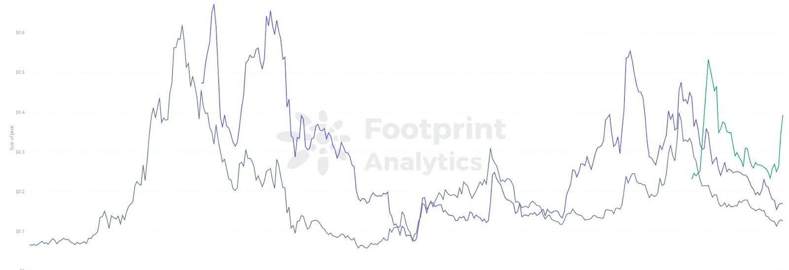 FootprintAnalytics:GameFiVolumebyChain目前Polygon上用戶量Top3的鏈游項目Arc8是一個移動電子競技游戲平臺,用戶可以玩游戲、擊敗對手,然后就能獲得GMEE代幣。Arc8具有優秀的游戲體驗,但是盡管添加了挖礦板塊,但從本質上Arc8只是將游戲積分屬于典型的傳統游戲,非典型的鏈游。REVV是REVVMotorsport賽車游戲元宇宙中的最新P2E游戲,代幣是REVV。在REVV中,汽車是NFT,用戶可以通過參加比賽或者直接購買獲得。REVV推出了線上賽車比賽,以高額的獎金吸引用戶參與,但是目前比賽的排行榜被大公會橫掃,普通玩家很難從中獲得獎勵。Pegaxy是一款科幻賽馬游戲,其科幻的畫風以及出色的游戲系統吸引了大批用戶。用戶可以通過購買或者租賃的方式選擇參加比賽的PEGA。不過目前該游戲的PEGA并不是NFT。從FootprintAnalytic的數據,除去已經下線的SunflowerFarmers,Polygon上GameFi的交易量幾乎全部由Pegaxy貢獻,而幾個GameFi項目的代幣價格也呈下降趨勢。