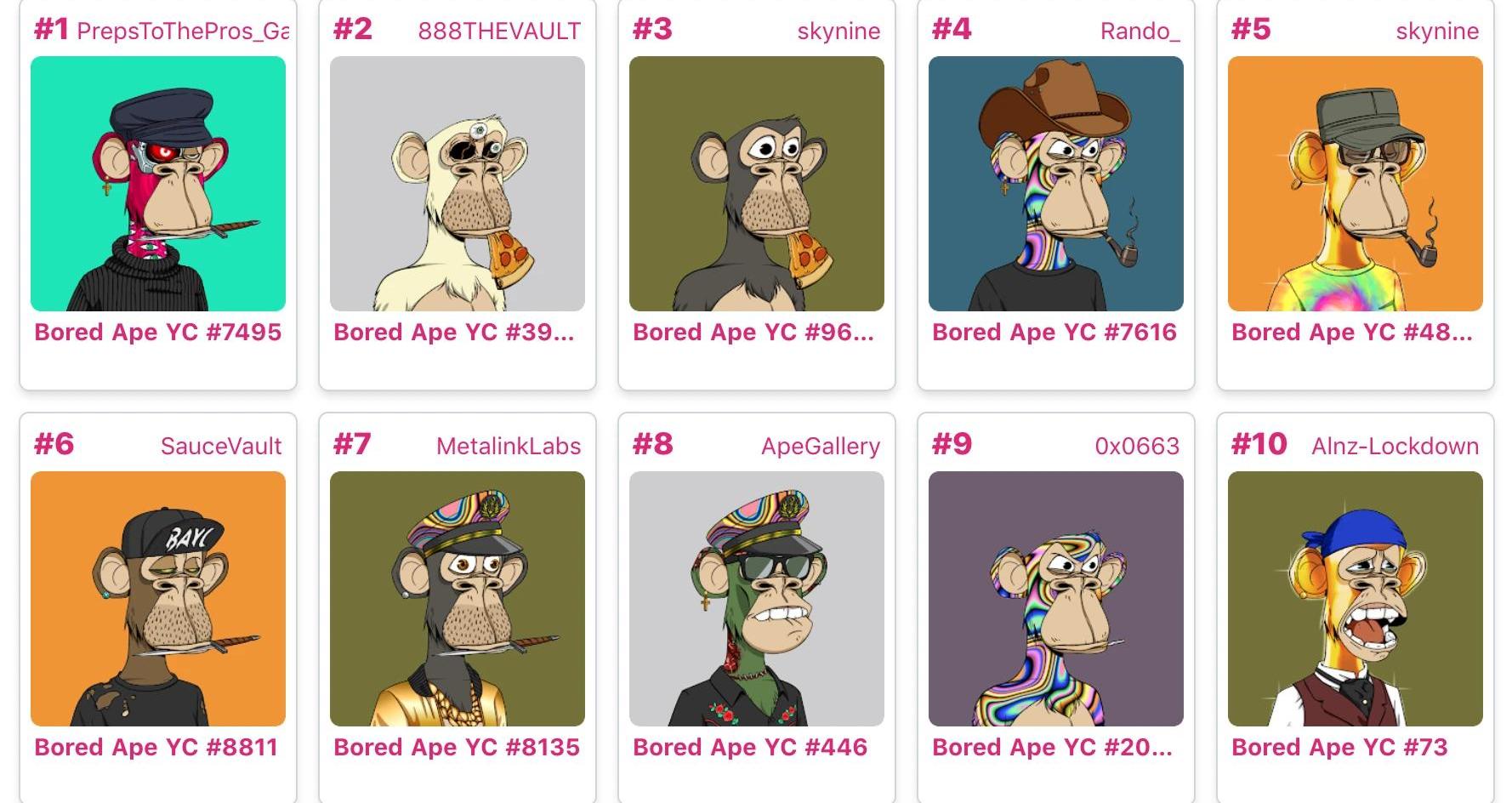 我們來舉個例子。下圖是RarityTools對BoredApeYachtClub前10的稀有度排序。