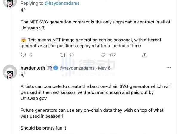 可以看到,在元數據的最前方標注了該做市頭寸的代幣對、做市價格區間、代幣地址以及聲明等信息。在后方的image字段內,保存的是以svg格式存儲的NFT圖像信息。這里稍微解釋一下svg格式。svg是一種圖片保存格式,其中文全稱為「可縮放矢量圖形」。我們知道,現在常用的圖片保存格式是基于像素的,比如我們的手機照片保存格式,便是把鏡頭采集到的每個像素的顏色一個一個保存在文件內,因此像素越高圖片就越清晰,同時所占用的存儲空間也就越大,也越難以在鏈上保存。而svg格式并不是通過保存像素來存儲圖片,而是保存圖形的形狀。例如:保存一個長寬比為2:1的矩形,底色為紅色,在左上角顯示代幣對的名稱等等。這種存儲圖像方式的優點是,形狀一旦確定便可以無限放大縮小,且其占用的存儲空間不受圖形大小影響,只與圖形的復雜度有關。因此這種存儲形式可以幫助在以太坊上低成本的存儲結構較為簡單的矢量圖片。又由于Uniswap的NFT全部采用同一個矢量圖模板,因此這個NFT的圖片樣式只需要在部署合約的時候存儲一次,之后每個新鑄造的NFT只用更新一下圖形中的代幣對等核心信息就可以生成新的NFT圖片。因此用戶并不需要為存儲這個圖片支付存儲成本。Uniswap的NFT元數據存儲方式,可以說是眾多NFT項目中最讓人眼前一亮的解決方案。他同時兼顧了幾個重要的需求。一是全鏈上保存,具有完全的去中心化與不可篡改性;二是不依賴網頁前端存儲的緩存數據就可以直接從鏈上讀取全部信息;三是不會涉及跨鏈調用數據的風險,不用擔心采用鏈外存儲的協議失效或被攻擊,只要信任以太坊的安全性,便可以完全信任該NFT的安全性。四是可以保存較為復雜的圖像,不像Autoglyphs項目那樣只能顯示簡單的圖形信息。當然談了這么多,最后還是要回到NFT的價值來源問題。其實對于Uniswap的NFT價值來說,其元數據保存在哪里,甚至是不是保存了元數據,都完全不影響其價值。因為Uniswap的NFT的價值,只取決于其可以從資金池中取回資產的價值。就像你持有的銀行存單,不論印刷質量是精美還是粗糙,只要能取回等值的貨幣,則存單本身美觀與否完全無關緊要。最后再總結一下UniswapNFT的基本特點。Uniswap的NFT其前端顯示圖片是在以太坊鏈上存儲,不可篡改但可以由團隊進行后續升級。根據其創始人的介紹,存儲元數據圖像的合約是整個UniswapV3智能合約組中唯一可以進行后續升級的智能合約組件。但不論其后續圖像如何改變,都不會影響其NFT的內在價值。