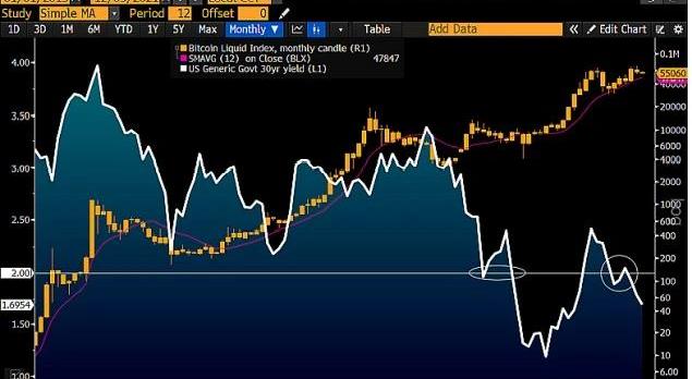 市場上資金已經從黃金轉向比特幣和以太坊,對于2022年來說,問題集中在流動性逆轉或加速上。隨著債券收益率下降,我們傾向于加密貨幣可以獲得更大流動性。與股票市場相比,加密貨幣有優勢嗎?與股市的不同強度以及2021年大幅下跌的基礎可能為2022年加密貨幣資產價格的進一步升值奠定基礎。2022年市場可能具有相對優勢。我們的圖表描繪了盡管標準普爾500指數在11月底出現下跌,但BloombergGalaxyCryptoIndex仍在上漲。需要注意的是,加密仍是風險資產,但主要資產——比特幣和以太坊——可能正在向價值存儲轉變。供應量減少是比特幣和以太坊兩個頭部加密貨幣共有的一個關鍵屬性。不管是早期采用這兩個加密貨幣的人,還是最近遷移到自己投資組合的人,需要注意雖然數字資產可能比擴大的股票市場具有優勢,但存在波動的風險,尤其是在美聯儲減少流動性的情況下。下圖:加密資產與股票市場的不同強度。