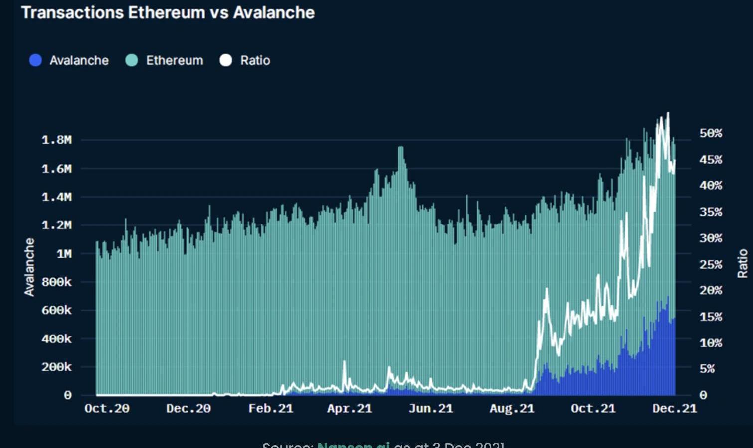 從上圖中還可以看出,在8月份,以太坊每天支付的天然氣費用開始顯著增加。這主要是因為夏季部署的NFT項目增多。以太坊高昂的天然氣費用迫使許多項目想在其他更便宜更方便的網絡上擴張。Avalanche能夠創建快速、低成本和堅固性兼容的dApps。因此,各種NFT項目都在利用網絡進行部署。例如,ToppsNFT市場、Kalao、Venly市場和Crabada。此外,Avalanche基金會最近籌集的200億美元基金中的一部分將專門用于NFT和文化應用。然而,值得注意的是,最活躍的Avalanche應用仍然是DeFidApps,如TraderJoe和Pangolin,分別占所有鏈上活動的23%和7.5%。Avalanche和以太坊之間的交易比率一直在顯著增加,尤其是自8月份以來。交易方面以太坊和Avalanche的對比