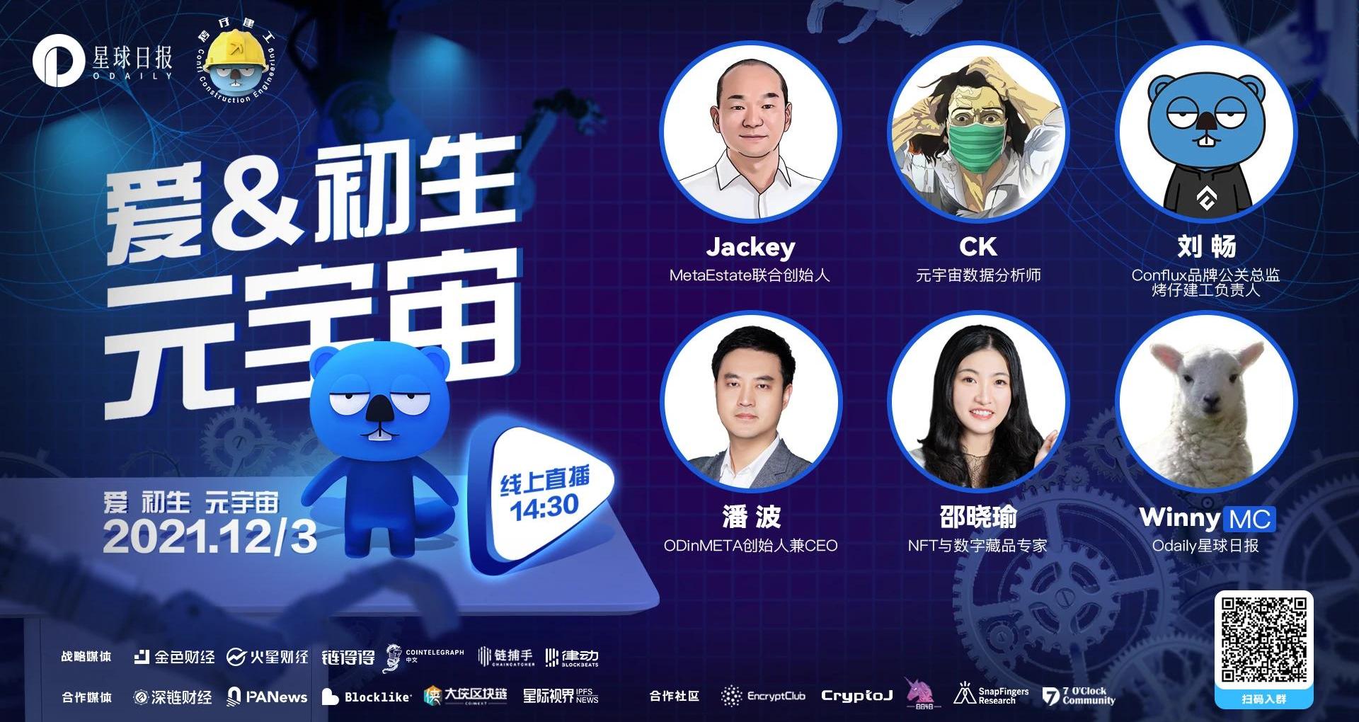 XRP/HKD-6.58%12月3日,Odaily星球日報聯合conflux共同舉辦了主題為「愛、初生、元宇宙」的線上直播。活動有幸邀請到MetaEstate聯合創始人Jackey、元宇宙數據分析師CK、Conflux品牌公關總監、烤仔建工負責人劉暢、ODinMETA創始人兼CEO潘波、NFT與數字藏品專家邵曉瑜、Odaily星球日報Winny參與圓桌討論,各位嘉賓就元宇宙概念內涵、發展現狀、社會價值等發表了精彩的觀點。