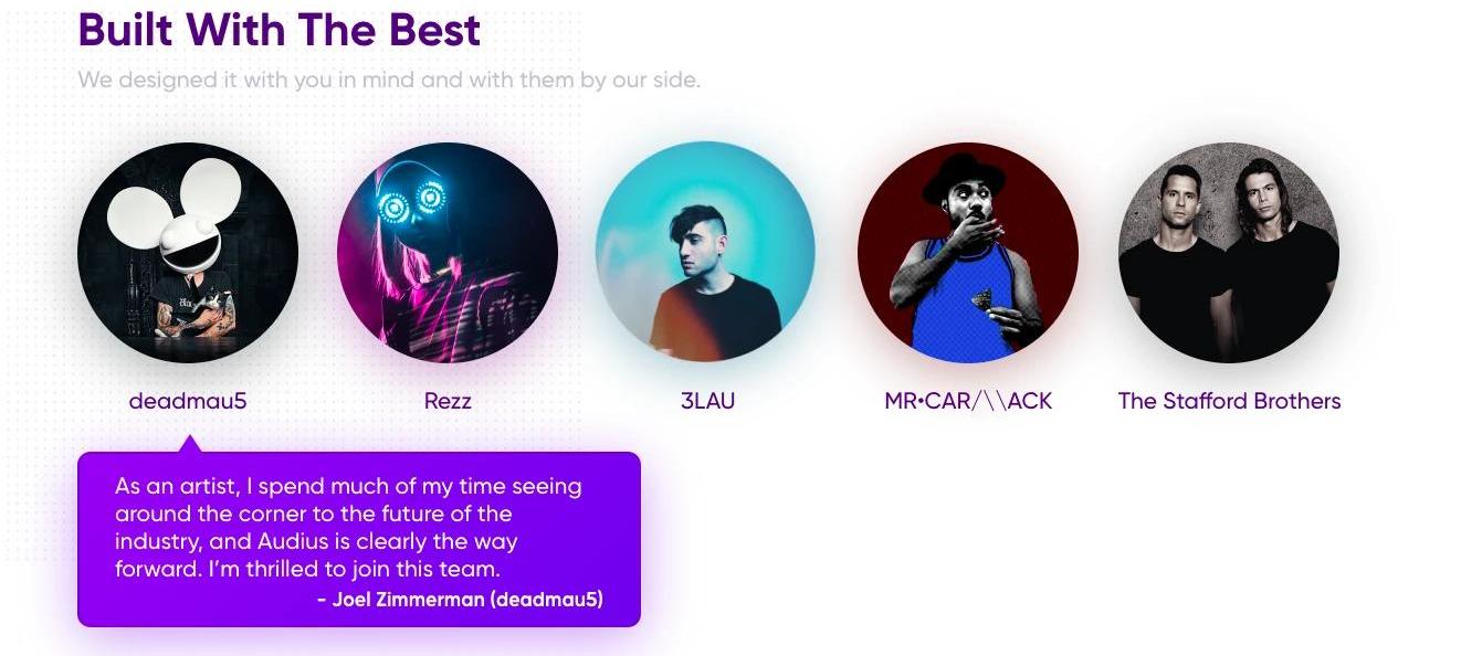 網站視覺風格:潮流風簡介:Audius是一個去中心化音樂共享和流媒體協議,平臺代幣AUDIO融資:2021年7月宣布獲得310萬美元戰略融資,MulticoinCapital及BlockchangeVentures領投,PanteraCapital和CoinbaseVentures參投。9月宣布已完成500萬美元融資,投資者包括KatyPerry、TheChainsmokers、Nas、JasonDerulo、PushaT、MarkGillespie等藝人以及索尼音樂前CEOMartinBandier、投資公司K5GlobalMichaelKivesCEO,表演權組織SESACCEOJohnJosephson。音樂人入駐:目前Audius月活已經達到600萬,10萬多條曲目資源和超過100萬的播放內容。已與deadmau5、3LAU、RAC等頂級藝術家達成合作。