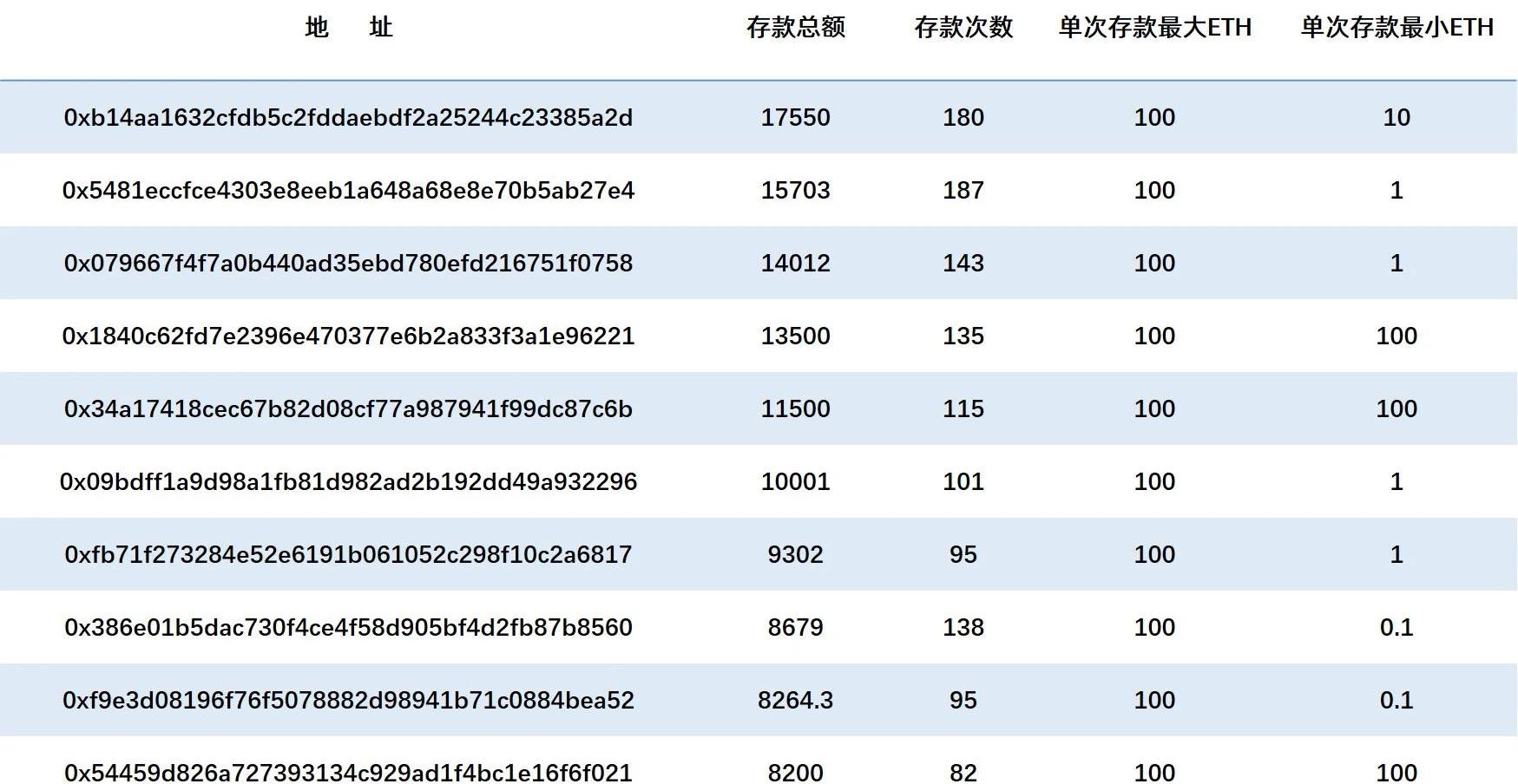 對所有交易進行存款、提款歸類后,統計了每個地址存/提款總額、次數、最大存/提款金額、最小存/提款金額統計。得到了22714個存款地址,31737個提款地址,其中存/提款總額Top10數據如下:存錢總額Top10