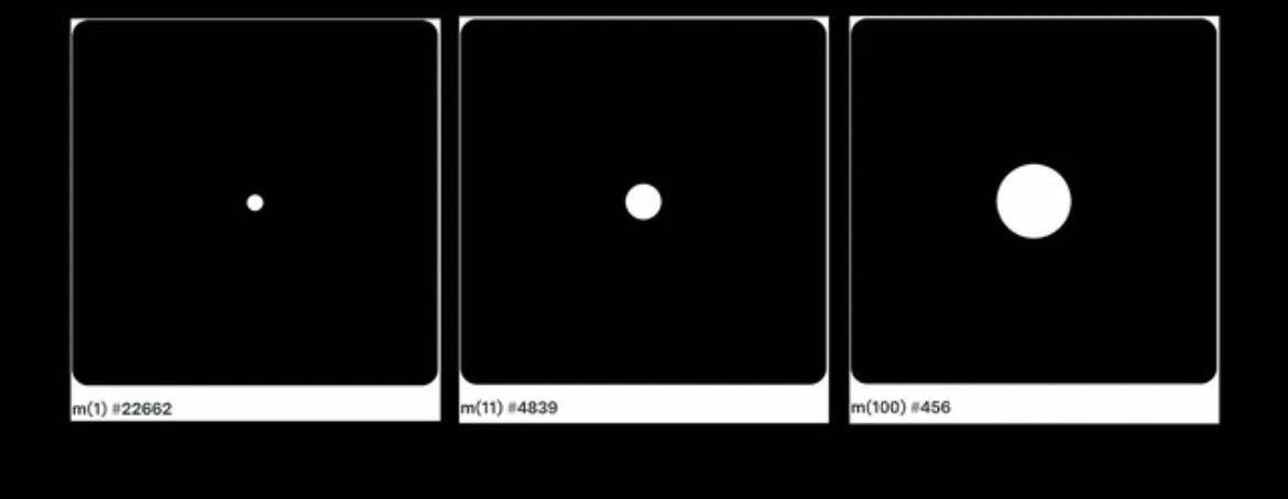 在外形上,“mass”是一個個小球,球的大小根據購買的數量來決定,每個錢包都只能擁有一個球,當買入第二個球時,兩個球就會合并成一個,顏色和體積也會發生變化。“吞并”會隨著二級市場的交易不斷發生,存在的球的數量也會越來越少。目前體積最大的一個球,是一個包含了12120“mass”的球。通過收藏者們的互動,整個作品的最終外觀會不斷發生變化,與其說是一張圖片,倒不妨說是編寫在智能合約上的交互藝術。