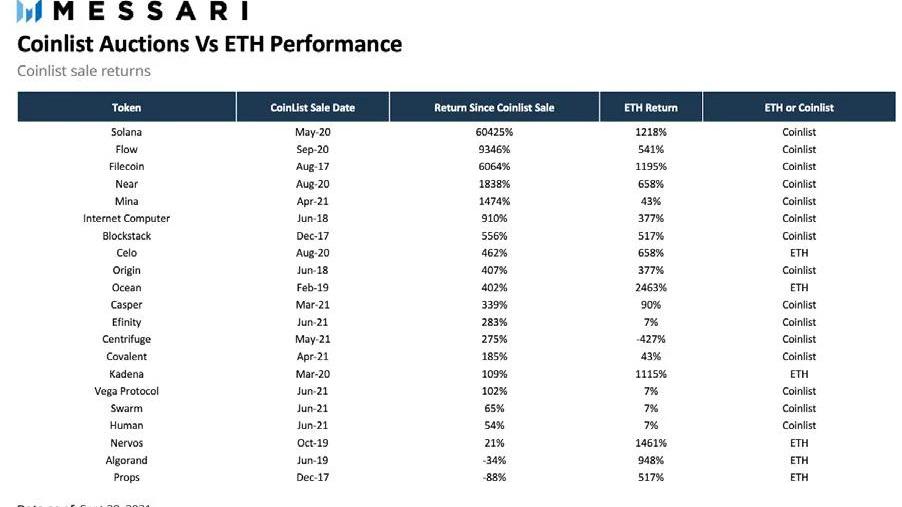 事實上,代幣銷售作為一類投資的表現比標準普爾要好—超過一個數量級。代幣銷售一直以來籌集了約200億美元。僅Binance(BNB)就交付了整個初始投資的5倍。以下是實際的數學,根據市值排名前15位的七個代幣銷售項目。這是在僅僅5億美元的投資資本上創造的3500億美元的價值……足以抵消所有失敗者本身近20倍的損失。這還不包括以太坊在2014年僅用1800萬美元的眾籌收益創造的5500億美元的市場價值。對于那些表現不佳,或根本沒有交付,或完全是騙局的代幣銷售,一個好的安全港會把這些脆弱的“未注冊證券“案件,變成大獲全勝的欺詐案件。聲稱代幣作為一個類別對投資者不利是無稽之談。如果是的話,它們是對美國證券交易委員會的一種控訴。投資者希望并需要今天的股票市場的替代品。參與代幣經濟—幾乎任何程度的多樣化—在歷史上都造就了贏家。以Mason最近對CoinList銷售的分析為例,這也是對Crenshaw說法的嘲弄。雖然美國在參與Coinlist大部分銷售的排除國家名單中,僅次于朝鮮,但以下是100美元投資在他們前20次銷售中的實際表現: