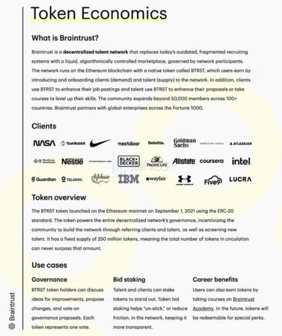 像Braintrust這樣的品牌就做到了這一點。他們的故事像其他人才網絡一樣開始,建立了一個有才華的自由職業者的社區,以及在這個古老的匹配場景中的一個堅實的客戶名冊。然而,通過引入BTRST這一DAO代幣,他們創造了一個共享價值體系,人才能夠通過加強他們的人才網絡、參加課程學習更多關于平臺的知識、推薦更多客戶,甚至為DAO的Discord設計表情符號和GIF來獲得賞金或代幣獎勵。