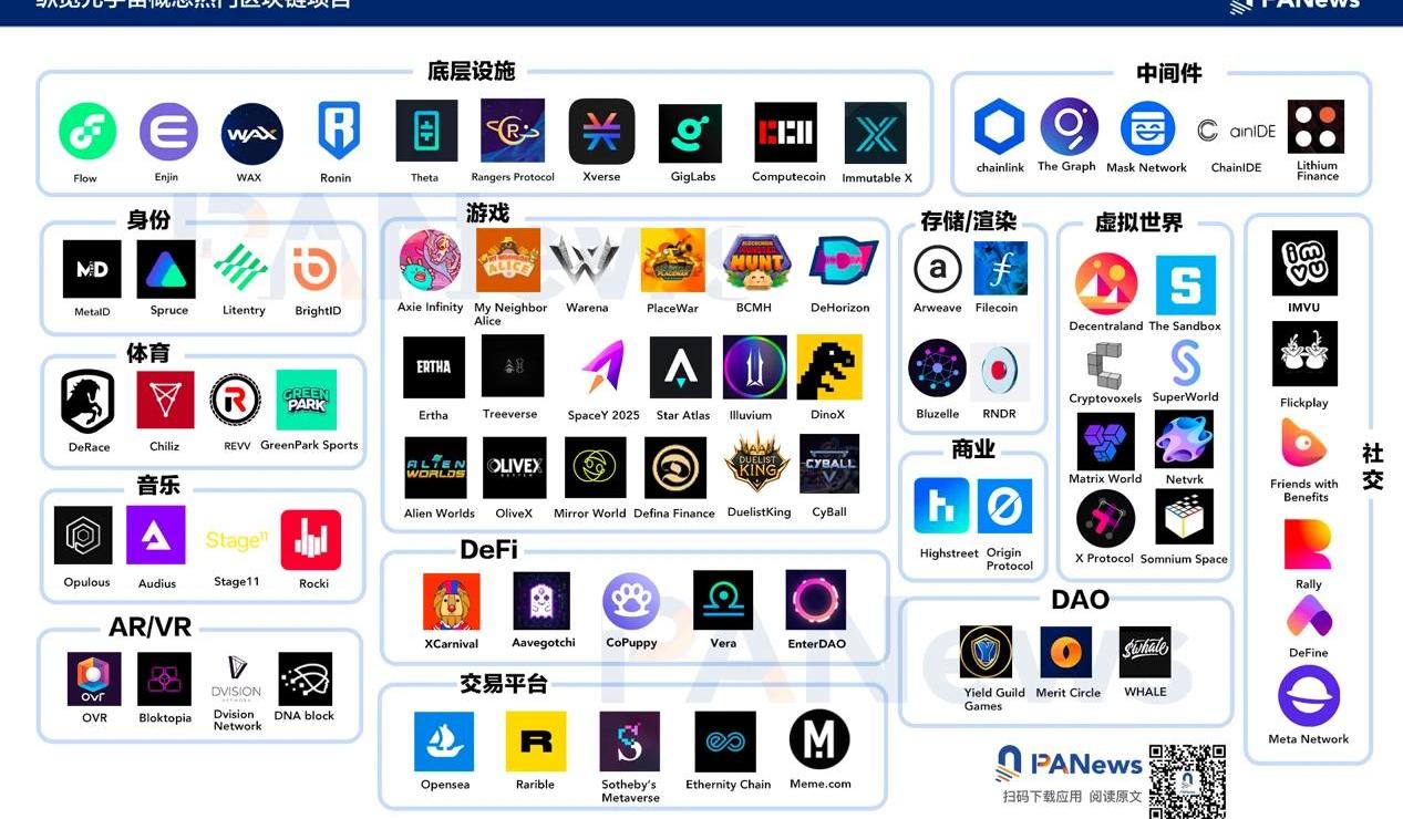 XRP/HKD-2.56%元宇宙無疑是當下炙手可熱的“當紅炸子雞”。除了社交巨頭Facebook毅然換“臉”更名“Meta”外,騰訊、谷歌、字節跳動、微軟和百度等科技巨頭也紛紛“上頭”,爭相奔赴元宇宙賽道。與此同時,聞風而動的資本也“沸騰”了,斬獲高額融資的現象亦比比皆是。盡管元宇宙的定義和場景仍相當模糊,但其被塑造的方式卻是多種多樣,社交、游戲、文娛等賽道均與元宇宙產生夢幻聯動,各類應用似有“亂花漸欲迷人眼”之勢。在元宇宙成為樂此不疲的談資之際,本文PANews將盤點區塊鏈領域中主打元宇宙概念的部分熱門項目。