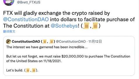 每一個DAO的成立或是因為同樣的愛好,或是為了共同做一件事,而這個DAO是為了買下美國憲法,它的名字就叫做「憲法DAO」。11月中旬,世界頂級拍賣行蘇富比將拍賣一份官方初版印刷的美國憲法,也是現存唯一一份掌握在私人收藏家手中的副本,蘇富比對其估值在1500萬至2000萬美元之間。這件副本上一次在市面上流通還要追溯到1988年,被一位已故的紐約房地產開發商以16.5萬美元的價格收入囊中。而這一次在蘇富比拍賣取得的收入也將捐給以其妻子名義成立的慈善基金會,以進一步提高公眾對民主的認識。短短幾天時間,ConstitutionDAO已經通過Juicebox募資平臺成功眾籌到了超1萬枚ETH,約合4300萬美元,加密貨幣交易平臺Gemini、Coinbase、頂級資本a16z等知名機構紛紛為其進行宣傳,此外,由于在蘇富比的拍賣需要使用法幣參與,FTXUS總裁BrettHarrison表示FTX也愿意為ConstitutionDAO提供加密貨幣與法幣的兌換服務。