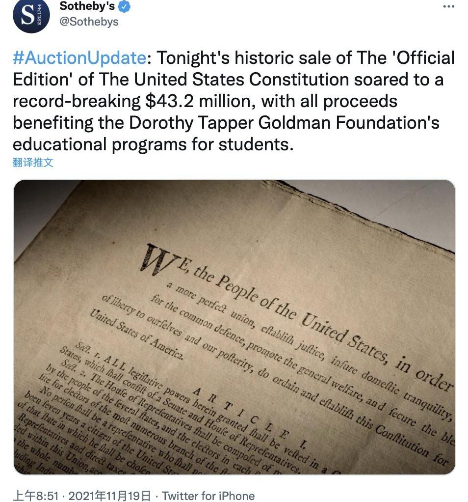 在人們將ETH捐贈個ConstitutionDAO后,將會獲得對應數量的PEOPLEtoken,據ConstitutionDAO官方所述,PEOPLE將會是ConstitutionDAO的治理token而非憲法所有權token,持有PEOPLE的用戶將共同決定ConstitutionDAO的未來發展,包括憲法的展出場所、展覽方式等等。在美國,人們認為《憲法》是人民主權的產物,越來越多人認為他們國家最重要的東西就是憲法,而憲法開頭的三個單詞「WethePeople」也成為了美國人最常當作口頭禪的一句話。如今,來自Crypto世界的DAO準備競標憲法也在全世界掀起了一股新的迷因浪潮,不僅是美國人,來自世界各地的Crypto居民都為ConstitutionDAO進行了捐款,助力ConstitutionDAO順利贏下拍賣。北京時間11月19日早晨,這本美國憲法在蘇富比開始了緊張刺激的拍賣,由于捐款信息在鏈上可查,ConstitutionDAO相當于是在「明牌拍賣」,早已被對方看清底牌。在經歷了數輪競價戰后,最終還是未能贏下拍賣,這本憲法最終以4320萬美元的價格成交。