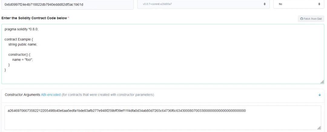 我快速復制了預期的字節碼,并用一些隨機字節替換了IPFS哈希,然后部署了生成的合約。果然,Etherscan像往常一樣考慮了不同的字節業務,并允許我的合約得到驗證。