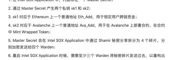 這不禁讓我想起來了此前Polygon爆發的走勢。與Avalanche類似,Polygon也是在推出了1億美元的流動性激勵基金后才迎來了用戶及資金量的暴漲。巧合的是,Polygon之上最早的一批激勵基金合作應用正是Aave、Cvure、Sushiswap,這與「AvalancheRush」的情況不謀而合。稍有不同的是,Avalanche此次給出的初始激勵力度更大,雖然兩大生態后續實際的激勵數額都會隨著二級市場的幣價波動而變化,但1.8億美元的初始投資足以看出Avalanche官方的決心之堅定。對于普通用戶來說,分享這1.8億美元的方式相當簡單,只需要在官方提及的合作項目中提供流動性即可,Avalanche會依照相應規則以AVAX的形式為所有流動性提供者分發代幣獎勵。因素三:跨鏈橋升級跨鏈橋的升級是Avalanche本輪生態爆發的另一大關鍵原因。今年二月,Avalanche曾推出了第一代跨鏈橋Avalanche-EthereumBridge,但作為初代產品,該橋在安全性、跨鏈速度、費用成本上仍存在著較大的改進空間。時隔半年,在廣泛聽取了用戶建議后,Avalanche于7月29日發布了新一代跨鏈橋產品AvalancheBridge。AB依托于IntelSGX技術構建。與當前市面上較為主流的合約托管型跨鏈橋不同,AB并沒有使用智能合約去管理跨鏈資金,而是在IntelSGX的可信環境內生成兩個普通的Ethereum和Avalanche地址,來完成跨鏈資金的管理和鑄造。具體的跨鏈流程如下圖所示: