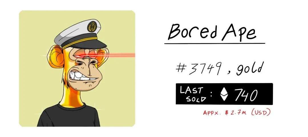 OpenSea上的無聊猿對于猿猴鑒賞家來說,突出的方面包括皮毛顏色、猿是否在吃披薩,以及發光的眼睛。BAYC在OpenSea上售價的最昂貴的物品之一是“#3749”,這是一只長著金色皮毛、戴著船長帽和紅色激光眼的猿猴。它的售價為740ETH,按目前的價格計算為270萬美元。