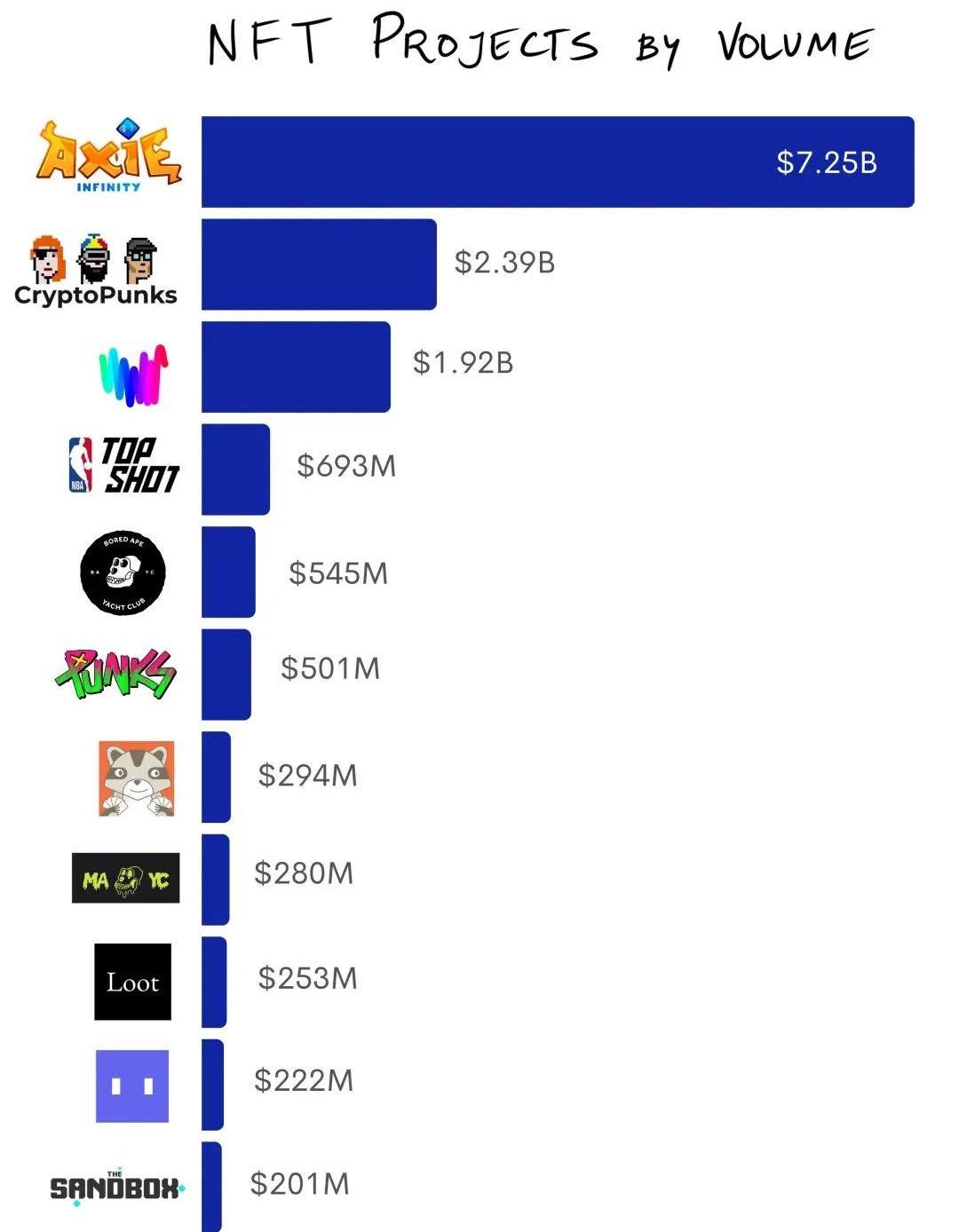 這些角色數量激增,在你的朋友和社交媒體上的追隨者中傳播,推動了進一步的收集、投機和投資。即使是業內人士也發現自己對這一現象感到驚訝,部分原因是它代表了與最初預期的偏差。正如RareBits的故事所表明的,NFTs被期望與游戲領域相銜接。像GodsUnchained和Decentraland、TheSandbox和AnimocaBrands等項目被期望推動這一領域的發展。總的來說,情況并非如此,有一個巨大的例外:AxieInfinity,它既是一個區塊鏈游戲,又是NFT項目中數量最多的。然而,如果從整體上看,PFP似乎是主導形式。按歷史交易量排名前十的項目中有五個可以合理地歸類為PFP產品。按數量計算,它們達到54億美元,占總數的37.3%。如果把Axie排除在外,用第11個項目Sandbox代替,PFP在這些項目中的份額將達到73%。