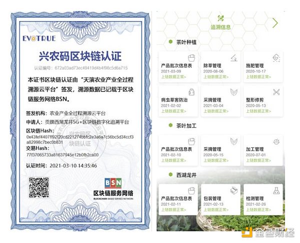 基于FISCO BCOS區塊鏈架構搭建,保障上鏈過程透明化,基于一品一碼模式,為每份茶葉提供具有全球唯一標識的區塊鏈認證證書,電子證書詳細記錄茶葉種植過程各環節上鏈數據hash、上鏈時間戳等,證書全過程溯源數據都存儲于BSN聯盟鏈的城市節點上,融合物鏈網技術,使區塊鏈+溯源應用的落地得到保障,該解決方案已經應用于包括貢牌、徑山等多個知名茶葉生產企業。