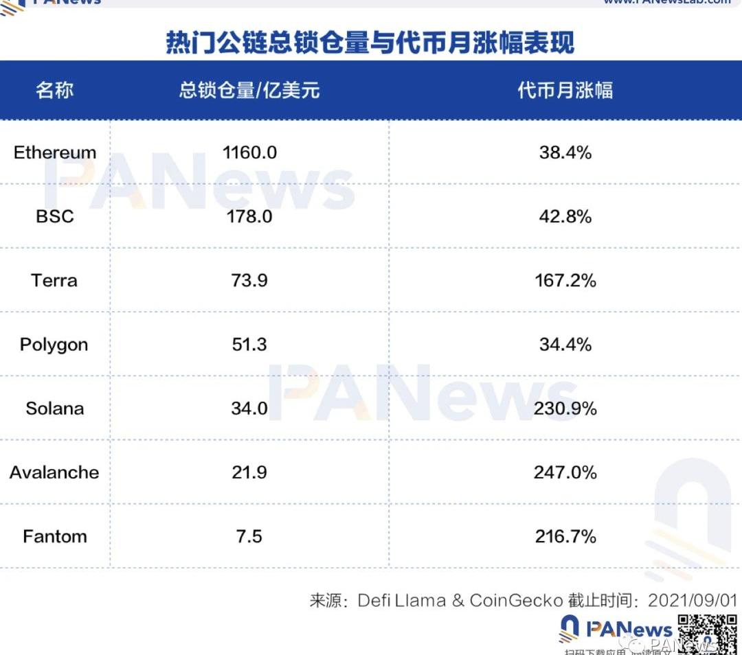 公鏈層面的生態激勵軍備競賽已經開啟。今年4月,Polygon推出1億美元DeFi基金“DeFiForAllFund”,將在未來兩到三年為DeFi項目提供支持,以提高DeFi的采用率、可訪問性和成本效益;7月,Terra宣布推出1.5億美元的生態基金,以扶植Terra生態內的應用,提升TerraDeFi生態的可訪問性;8月,Avalanche基金會宣布將推出1.8億美元的流動性挖礦獎勵計劃AvalancheRush,鼓勵更多應用和資產加入AvalancheDeFi生態;同月,Fantom則為TVL超500萬美元的項目發放總計3.7億枚FTM獎勵。此外,Celo也于8月宣布聯合Aave和Curve等推出超1億美元的“DeFiforthePeople”項目,旨在實現DeFi在移動端的使用。在8月份宣布流動性挖礦激勵之后,Avalanche已成為生態發展最快的公鏈。當月,Avalanche中的鎖倉量由1.84億美元上升至20.7億美元,上漲超過十倍。而其中的借貸協議BENQI,目前鎖倉量已經達到12億美元,治理代幣QI從8月19日的0.5美元附近最高漲至4美元。DefiLlama數據顯示,截至9月1日,DeFi的總鎖倉量已達1612億美元,創歷史新高。與去年同期相比,DeFi總鎖倉量增長了逾19倍。但是各條鏈上的發展出現了分化,頭部公鏈增速明顯放緩。其中,盡管以太坊以近1194億美元的鎖倉量占據著市場絕大部分份額,從今年年初至今年5月,以太坊的總鎖倉量上漲了350%,而5月至今僅上漲了28.1%。與此同時,一些公鏈上的生態并沒有恢復到5月份的高點。各條公鏈開始相繼以平臺幣進行激勵,前期會伴隨著TVL的快速增長,代幣價格也隨之上升。但隨著資金的過度涌入,以及其它公鏈的競爭,資金將會流向收益更高的地方。BSC以178億美元的鎖倉量也占據著TVL的11%,雖然較年初增長了286倍,但鎖倉量從5月份加密市場重創后至今下降了30%。經過近一年時間的發展,BSC上鎖倉量超過20億美元的仍然只有去中心化交易所PancakeSwap與借貸協議Venus,整體生態不夠完善。隨著CAKE代幣價格的下跌與減產,PancakeSwap對于用戶的吸引力可能也會降低。而前幾個月開始生態激勵的Polygon,當前TVL嚴重下滑,降至52億美元,只有接近5月高點時的一半。