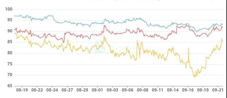 以太坊期權持倉量146萬張,價值42億美元,成交量12萬張。10d105%30d98%90d90%1Y108%各標準化期限IV:今日:1m102%,3m105%,6m106%,DVol110%9/21:1m96%,3m105%,6m107%,DVol103%以太坊跌破3000美元的強支撐,共識的關鍵支撐價格跌破對后市的影響比較不好。中短期限IV已經上漲近20%,以但中遠期IV上漲較少。
