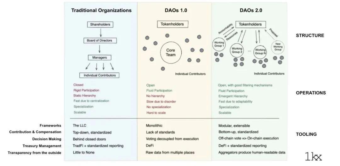 與傳統組織相比的DAO結構和工具摘要,請注意,這是一個非常籠統的描述雖然DAO工具有助于我們根據首要原則重新設計組織,但我們仍需要迭代最佳實踐并通過實驗學習。今天,我們組織設計的許多思維模式,都是20世紀以裝配線為中心的工作場所遺留下來的。圍繞DAO的創新也將摒棄關于人類協調如何工作的過時觀念。我們應該小心,不要盲目地從傳統組織中引進我們已經習以為常的東西,并將它們改造成我們正在努力創造的正和生態系統。與其前身不同,web3組織工具堆棧將適應多對多關系、流暢的參與和至關重要的所有權。我們將看到更多的人將他們的時間分配到多個DAO中,在他們關心的不同事情上利用各種技能。DeFi協議的戰略家可能會借用她的技能在NFT收集器DAO中預測投資組合價值,并通過DAO支持未來的創造者。她將能夠將她的身份和聲譽移植到不同的應用程序中,并指出她為整個生態系統創造的價值。今天,拓荒者、建設者和一些幸運的人生活在這個未來。本文中提到的項目每天都在降低障礙,使DAO成為可行的途徑。本文來自Defi之道,星球日報經授權轉載。