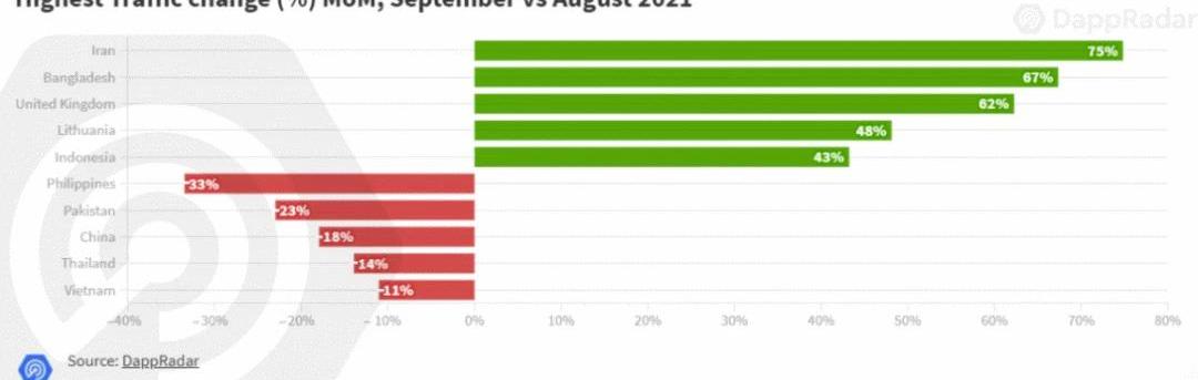 與上個月相比,流量增長最顯著的國家是伊朗。這個中東國家最近參與了政府關于加密貨幣開采的討論。相比之下,東南亞國家的流量一直在減少。例如,來自菲律賓的流量環比下降33%,而泰國和越南的流量分別比8月份下降了14%和11%。