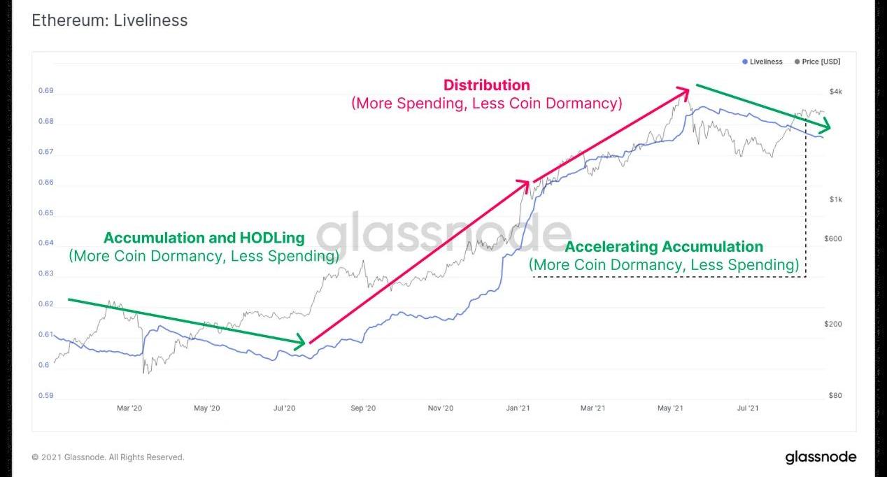 以太坊也顯示出類似的趨勢,高達70%的籌碼至少休眠了3個月以上。比特幣和以太坊的長期籌碼供應在2021年3月份開啟了上升趨勢,反映了在整個牛市進程中購買和持有的需求非常強勁。