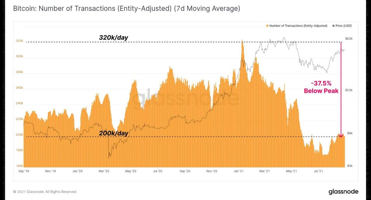 隨著幣價反彈,整個8月份,鏈上都在套現利潤,但幣價并沒有回落太多,且aSOPR保持在1.0上方,這表明潛在的市場買盤力量能夠吸收鏈上拋壓。隨著aSOPR多次重置到1.0附近,隨后都反彈到更高位置,這表明盈利的持有者更愿意繼續持有,而新的買方正在逢低進場。鏈上活動分歧在價格上漲的同時,鏈上活動仍然表現出較大的分歧。盡管幣價已經回到較高的交易區間,但比特幣和以太坊區塊鏈的空間需求仍遠低于此前的峰值。