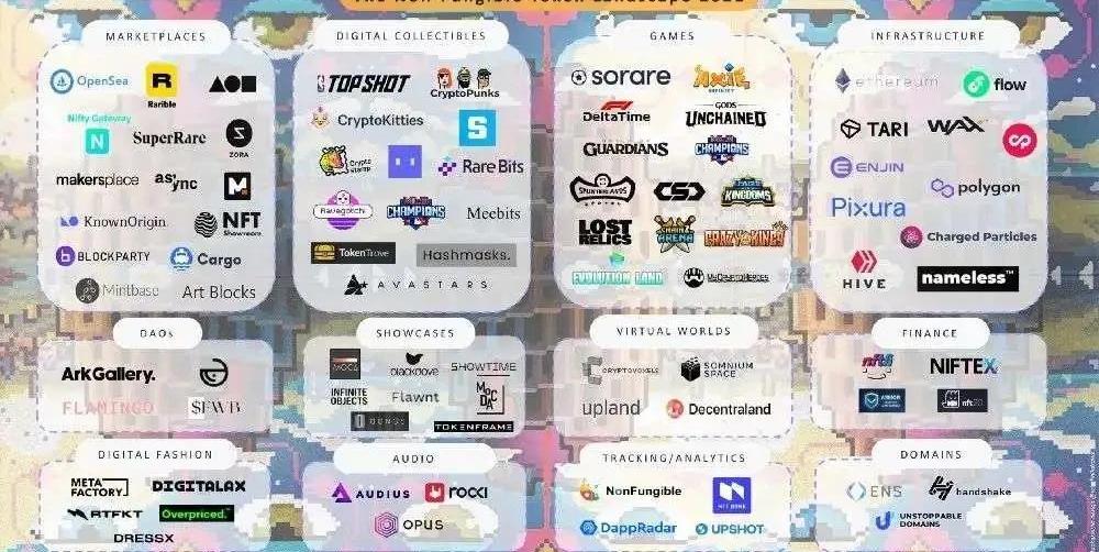 綜合性交易平臺NFT交易平臺中的龍頭OpenSea成立于2018年,是目前全球最大的加密數字藏品市場,商品數量很多,囊括了各種類型,今年3月,OpenSea籌集了2300萬美元的資金。在上周短短兩天內曾創造了9500萬美元的銷售額,相比2020年該市場全年的銷售額為2100萬美元而言,直接昭示著NFT的熱度。另外,Rarible也是一個發展的還不錯的綜合性的交易平臺,幾乎包含了藝術、收藏品、虛擬現實、游戲、實用品和體育等所有類型。據Crunchbase的數據,Rarible交易平臺已經籌集了180萬美元的資金。基礎設施目前為止,按銷售額排名前10的NFT項目中有大部分是建立在以太坊上的,因此高昂的gas費用、網絡擁塞仍然是一個問題,因此這里的基礎設施主要是指NFT的公鏈和側鏈。首先第1層基礎層是Ethereum和DapperLabs開發的Flow。除了使用的以太坊之外,為提高用戶體驗,DapperLabs實現了在Layer1上打造區塊鏈的高擴展性,創建了一條為游戲和NFT的公鏈——Flow。據Flow官網顯示,與傳統架構相比,在不影響安全性或去中心化的前提下,Flow的吞吐量提高了約50倍,交易費也顯著降低。第2層和側鏈:WAX、Polygon、Enjin開發的波卡上的公鏈Efinity等。WAX區塊鏈是專門為NFT交易而設計的,作為一家全球虛擬資產交易平臺,被稱為NFT市場快速崛起的幕后推手之一,憑借著OPSkins在成立之初便坐擁百萬級用戶基礎。Polygon生態中游戲、NFT和DeFi占據主導,目前有Showcase、TerraVirtua等熱門應用。NFT在波卡生態的發展中,Efinity較為有名,開發者可在Efinity鏈上開發NFT應用。數字收藏品平臺主要功能是發行收集類NFT,這些Token可以用于游戲或是玩家之間互動,如上文提到的CryptoPunks就屬于其中一種,將NFT帶入了主流。另外,還有NBATopShots,是Flow平臺上領先的NFT項目,是第一款基于區塊鏈的NBA數字收藏品游戲,由NBA與CryptoKitties創始團隊DapperLabs合作推出,并受到不少球星的投資支持,一舉成為當前市場上最為火熱的NFT產品之一。游戲最近在NFT領域在火爆的游戲無疑就是AxieInfinity,它的收入在圈內碾壓了Uniswap,圈外秒殺了王者榮耀,今年6月以來,AxieInfinity活躍用戶持續增長,其TokenAXS也屢創新高。另外,TheSandbox游戲虛擬世界出售了300萬美元的LANDSNFT,超過2019及2020年度總和。其他著名的NFT游戲包括GodsUnchained、GuildofGuardians、Splinterlands等,可以看看這篇匯總文章。不僅如此,NFT在金融、域名、跟蹤分析、音頻和虛擬游戲等方面的生態也都在逐步建立。作為一個新興的小眾加密領域,盡管目前市值規模依舊較小,越來越多的名人、畫家、球星、歌手、收藏家、藝術家參與投資NFT此產品,整個生態更加豐富繁榮。03名人參與大廠布局備受關注的NFT面臨新困境
