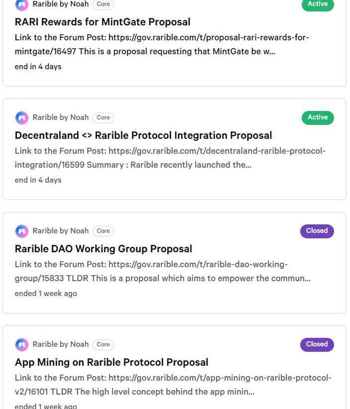 特色項目RaribleRarible是最早的關于NFT的DAO項目之一,成立于2020年初,是一個由DAO驅動的NFT交易平臺。如下圖顯示,截至2021年七月底,在AUM排名前十名的DAO組織中,RaribleDAO以1億4千萬美金的AUM居于第五位,是NFTDAO組織中資產管理規模最大的社區。截止到目前總共進行過112次提案,6602次投票,2051個社員參與,平均提案獲得58.9次投票,投票參與度為8.26%。值得一提的是,Rarible在投票參與度方面遠高于AUM靠前的DeFi項目以及其他NFT項目,是較為活躍的社區之一,社區治理狀況較好。Snapshot顯示七月Rarible社區的提案包括MintGate的Rari代幣獎勵、Rarible與Decentraland的integration、DAO的工作小組,以及Rarible上的AppMinting等等。