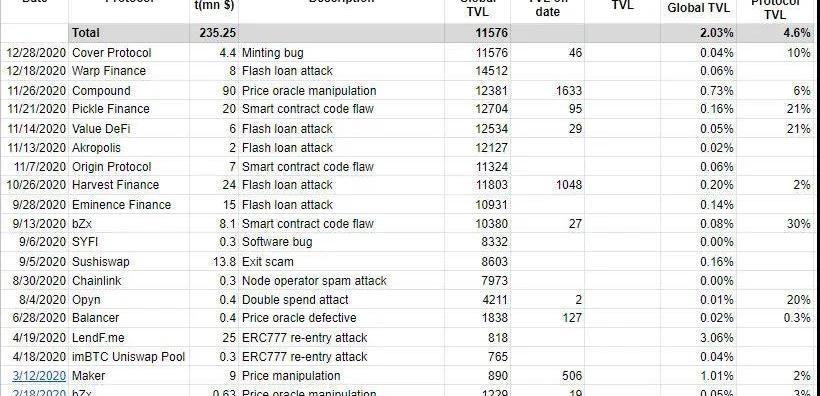 讓我們考慮一下2020年全年的黑客攻擊/漏洞利用。為了簡單起見,我們只考慮主要的因素。截至2020年,共有20起黑客攻擊/漏洞,造成總計2400萬美元的損失。TVL(總鎖定價值)到2020年底是1.56億美元。