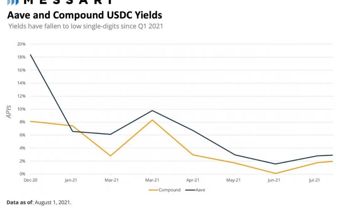 “Farming”收益率曾高達三位數,盡管波動性最小的策略現在收益率只有個位數。USDC的Yearn金庫提供7.51%的凈年化收益率,但明天可能是現在的一半,也可能是兩倍。