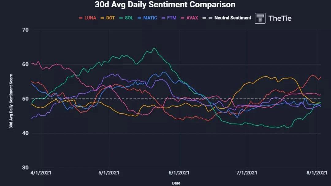 自4月1日,Luna的日均情緒30天平均值已攀升至50以上,并首次在競爭對手中處于領先地位。