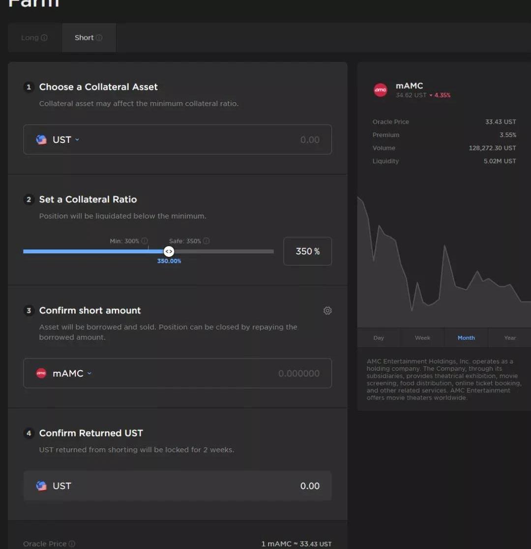 MirrorFinance是Terra生態系統中另一個最大的TVL所有者。在202年12月推出的Mirror是一個協議,它創建了名為mAssets的合成資產,"鏡像"其鏈外對應的價格。例如,mTSLA將跟蹤特斯拉的價格。目前Mirror上列出的資產有mQQQ、mAAPL、mBABA、mTSLA、mNFLX、mUSO、mAMZN、mVIXY、mGOOGL、mTWTR、mMSFT、mSLV和mIAU。用戶可以鑄造mAssets,進行交換,提供流動性,并進入"多頭"和"空頭"農場。該協議也有自己的原生代幣,稱為MirrorToken。這是用來獎勵那些為池子提供流動性的用戶,它也可以被用來賺取治理投票權,以及賺取協議的CDP提款費用的一個百分比。就像Dai一樣,用戶投入他們的UST、aUST或mAssets,進入抵押債務頭寸。這使用戶能夠鑄造mAssets。鑄幣商必須保持他們的CDP抵押品比率,并可根據需要進行調整。多頭和空頭農場是MirrorV2的新內容。就像它們聽起來的一樣,它們在有關資產上采取定向頭寸,但允許用戶賺取MIR的APR。空頭農場為你借入mAmAsset,并在市場上以UST出售,當你完成后,你必須以UST償還該金額。*song農場基本上就是一個LP池,你必須提供mAsset和等價的UST,以獲得MIR獎勵和池子獎勵。*提示:你可以通過交換界面在現貨持有中購買等量的mAsset,使你的空頭農場delta中立。這可以在從Anchor賺取20%APY的基礎上進行,因為Mirror讓你用aUST作為抵押品!這樣,如果你持有的mAsset出現問題,你就可以用它作為抵押。這樣一來,如果你做空的mAsset上漲,你就持有等值的標的物,從而償還你的空頭。
