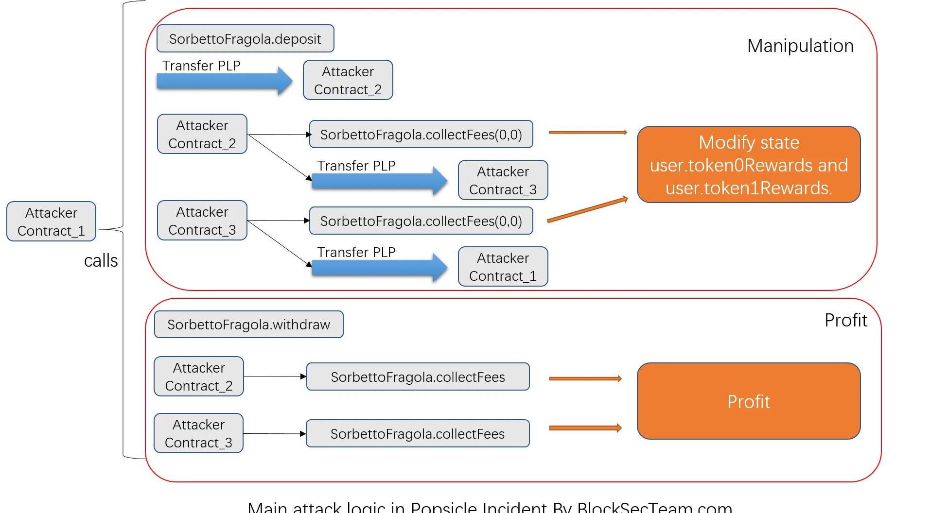通過以上的代碼分析,我們發現了PopsicleFinance在機槍池實現上的漏洞。下面我們對攻擊交易進行深入分析,看攻擊者是怎樣利用這個漏洞的。攻擊者的總體流程如下:攻擊者創建了三個交易合約。其中一個用于發起攻擊交易,另外兩個用于接收PLPToken并調用PopsicleFinance機槍池的collectFees函數取回存款獎勵。通過閃電貸從AAVE借出大量流動性。攻擊者選擇了PopsicleFinance項目下的多個機槍池,向AAVE借出了對應這些機槍池的六種流動性。進行Deposit-Withdraw-CollectFees循環。攻擊者一共進行了8次循環,分別攻擊了PopsicleFinance項目下的多個機槍池,取出了大量流動性。向AAVE歸還閃電貸,并將獲利通過TornadoCash洗錢。