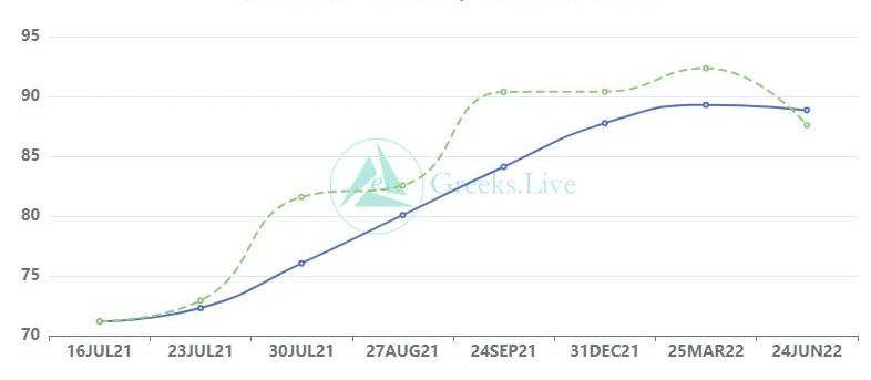 播報數據由Greeks.live格致數據實驗室和Deribit官網提供。低波動水平已經維持超過一個月,RV臺階式下降。比特幣10DRV從150%下降到50%,1MRV從120%下降到85%。以太坊波動同樣比較低,10DRV從300%下降到88%,1MRV從200%下降到108%。期權成交量1.61億美元,期權持倉量為42億美元。10d50%30d85%90d96%1Y76%各標準化期限隱含波動率:今日:1m80%,3m86%,6m88%,DVol90%7/12:1m80%,3m86%,6m88%,DVol90%比特幣繼續在33000美元附近振蕩,成交量維持較低水平,比特幣的短期RV自4月以來首次下降到50%,下降十分明顯。