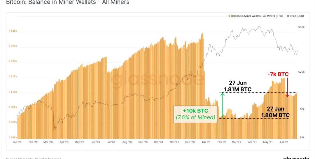 比特幣挖礦難度同期,挖礦難度僅增加了23.6%。礦工收入和挖礦難度之間不匹配主要是由于全球半導體短缺限制了礦工擴大業務的能力,也意味著整個2021年的挖礦利潤非常可觀,而一些本已過時的礦機仍然可以盈利。礦工并不需要出售大量的比特幣來支付成本,甚至仍可以繼續囤幣。由于目前很大比例的算力處于離線和運輸途中,下一次難度調整預計會下調25%。因此,除非幣價進一步下跌或被迫遷移的算力重新上線,否則繼續運營的礦工可能會在未來幾周內獲得更高的利潤。因此,目前仍在運營中的礦工不太可能過度拋售,因此中國礦工清算有可能是主要的拋售來源。