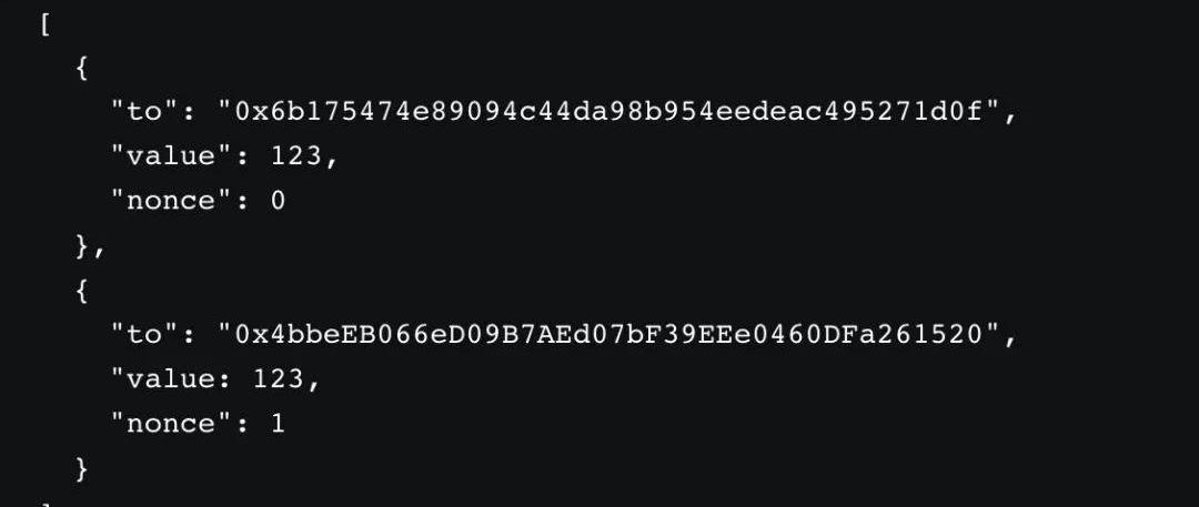 授權消息格式,包括可用于提交的示例提交描述了EOA提交的對象,并且可以根據調用的某些屬性(如地址、值)進行計算。調用者合約可以根據提供的屬性重新計算提交,如果這些字段正確,則執行授權。例如,假設我們想要發送以下交易(表示為JSON):